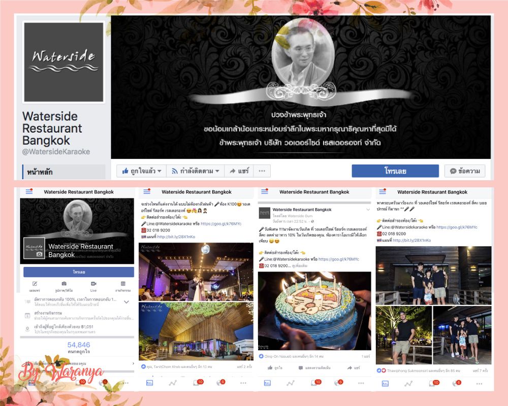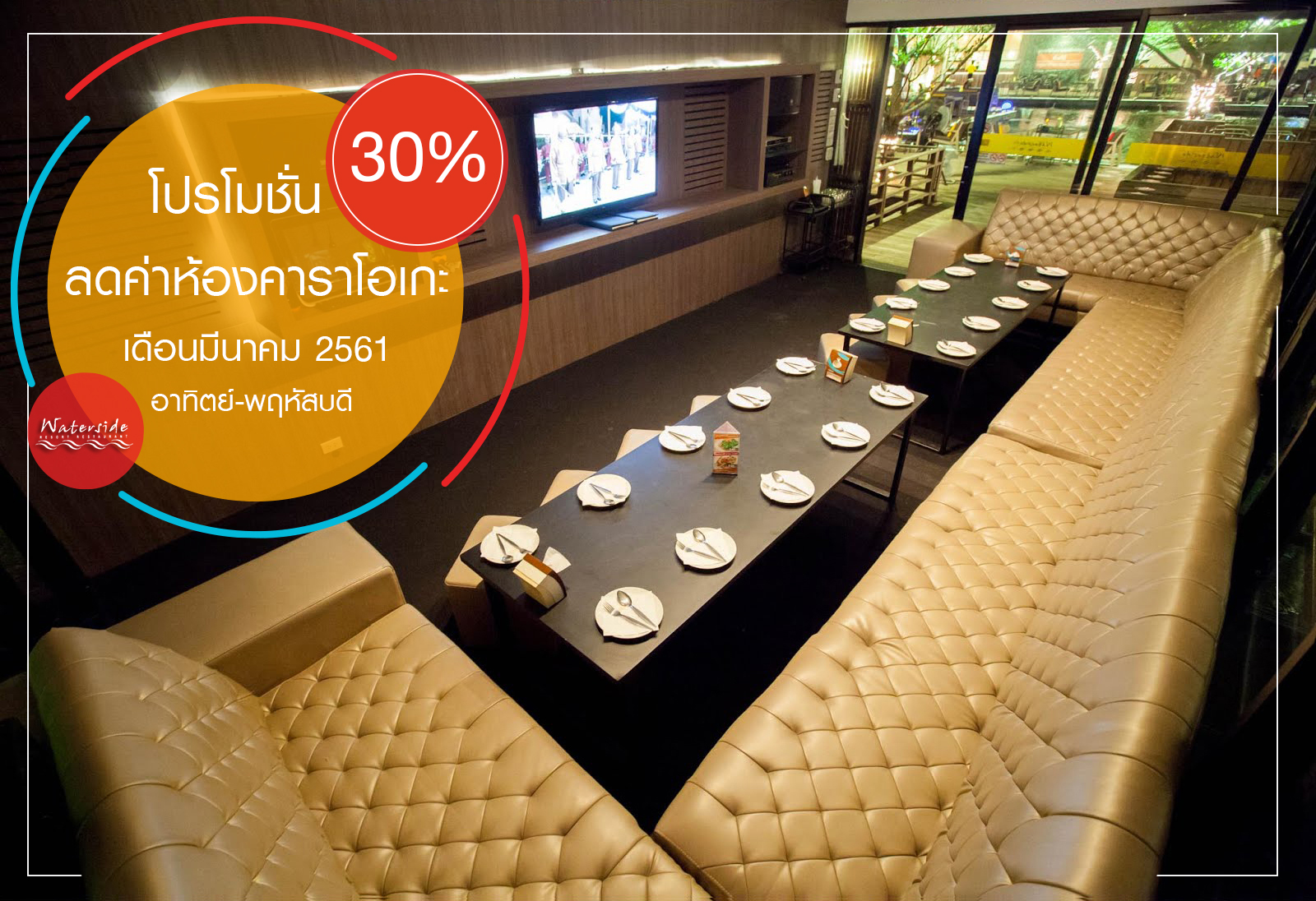 และชิดริมน้ำทุกที่นั่ง ทั้งแบบ outdoor และ indoor อีกทั้งมีมุมโรแมนติกที่มีความเป็นส่วนตัวสำหรับคู่รัก และมุมเฮฮาสังสรรค์กับเพื่อนฝูง นอกจากนี้ยังมีห้องคาราโอเกะ ที่ทันสมัยให้บริการอีก 52 ห้อง สามารถรองรับลูกค้าได้ตั้งแต่ 10 ถึง 200 ท่าน สำหรับจัดงานวันเกิด,งานแต่งงาน,งานเกษียณ,งานปิดกล้องละคร,งานเลี้ยงรุ่น,งานบายเนียร์,งานเลี้ยงรับปริญญา ก็ได้ และทุกห้องต้องชิดริมน้ำเช่นเดียวกัน ซึ่งภายในแต่ละห้องมีบรรยากาศที่ต่างกันไป ระบบภาพติดตั้งด้วยจอ LCD 60 นิ้ว และสมบูรณ์แบบด้วยระบบเสียงจากลำโพง JBL เมนูเพลง อัพเดททุกอัลบั้ม ทุกเดือน การเลือกเพลงทันสมัย แบบ 3 ทาง ห้องขนาดใหญ่สำหรับจัดเลี้ยง ก็มีแสง สี เวทีพร้อม